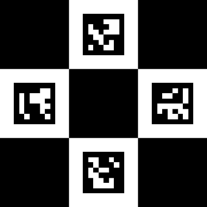 这将创建一个方格大小为 200 像素,标记大小为 120 像素的菱形标记图像。标记 ID 以第二个参数的形式给出,作为一个 `cv::Vec4i` 对象。菱形布局中标记 ID 的顺序与标准 ChArUco 棋盘格中的顺序相同,即顶部、左侧、右侧和底部。