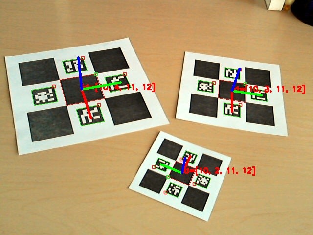 另一方面,菱形标记的检测不是基于标识符。相反,它们的检测是基于标记的相对位置。因此,可以在同一个菱形标记或不同的菱形标记中重复使用标记标识符,并且可以同时检测它们而不会产生歧义。但是,由于基于其相对位置查找标记的复杂性,菱形标记的大小限制为 3x3 个方格和 4 个标记。