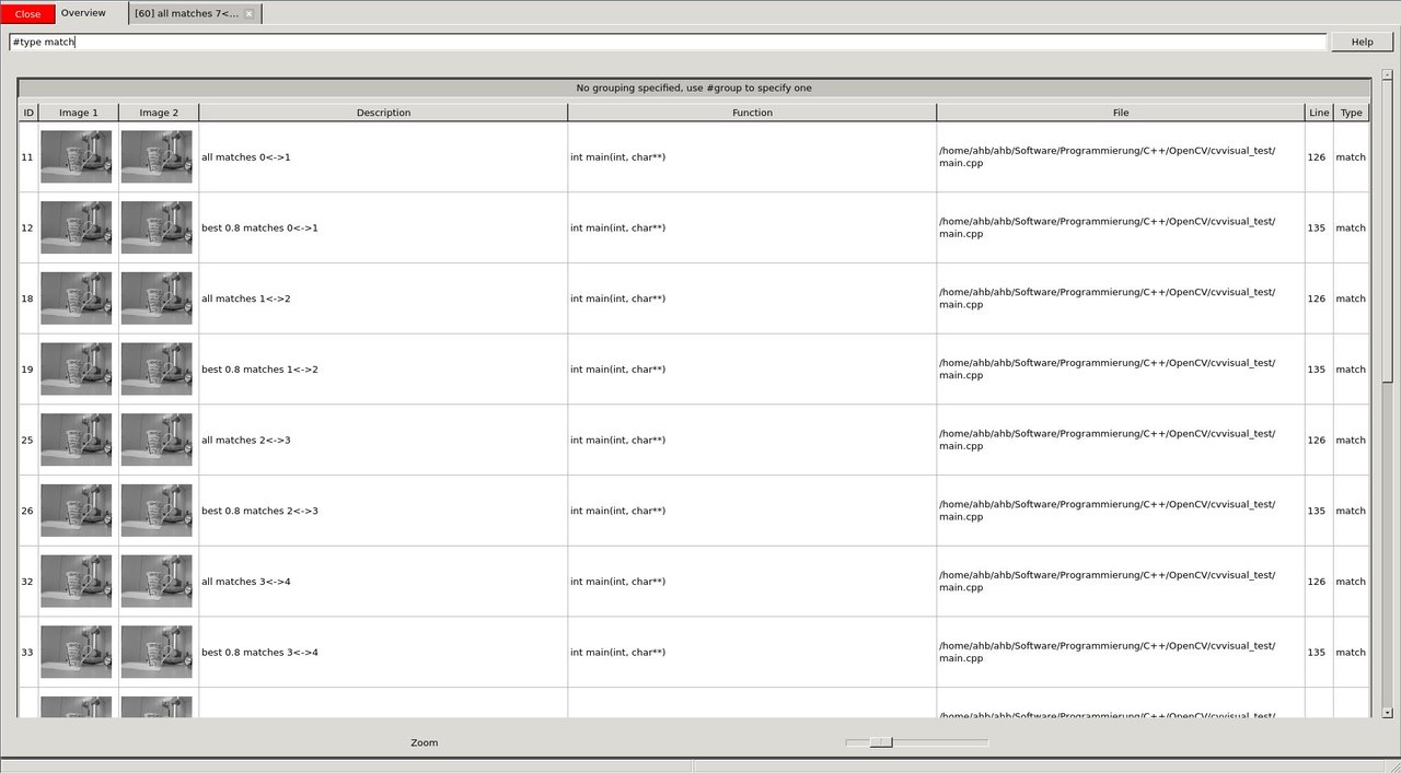 - 第一个cvv调用只是显示图像(类似于imshow),并使用imgIdString作为注释。图像将添加到可视化调试GUI的概述选项卡中,并且cvv调用将阻塞。