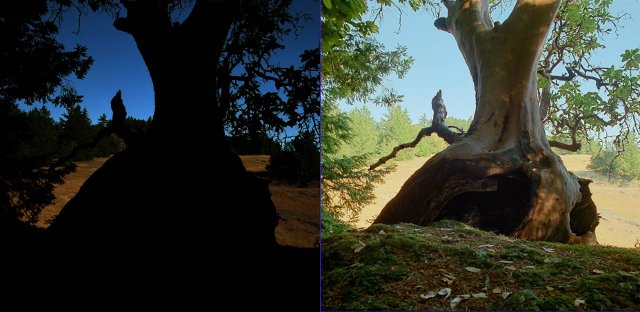 在下图中,应用了[25]中提出的思想,如同您的视网膜一样,局部亮度适应、空间去噪和光谱白化协同工作,在较低范围的8位数据通道上传输准确信息。在这张图片中,噪声被显著消除,被强烈亮度对比度隐藏的局部细节得到增强。输出图像保持其自然性,视觉内容得到提升。颜色处理基于[69]中提出的颜色多路复用/解复用方法。