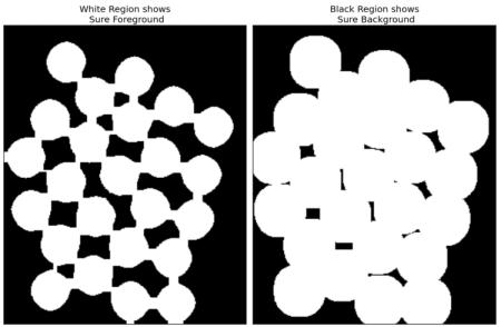因此,我们需要提取我们确定它们是硬币的区域。腐蚀会移除边界像素。所以无论剩下什么,我们都可以确定它是硬币。如果对象不相互接触,这将有效。但是由于它们相互接触,另一个好的选择是找到距离变换并应用适当的阈值。接下来,我们需要找到我们确定它们不是硬币的区域。为此,我们膨胀结果。膨胀会将对象边界增加到背景。这样,我们可以确保结果中背景中的任何区域都是真正的背景,因为边界区域已被移除。见下图。