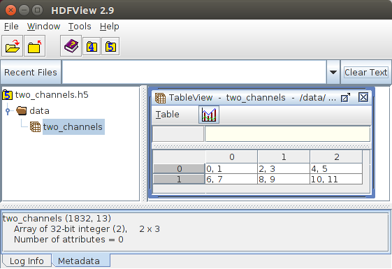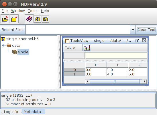 图 1 显示了使用工具 HDFView 可视化文件 root_group_single_channel 的结果。图 2 和图 3 分别给出了非根组直接子数据集矩阵的结果。