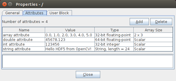 - 尽管属性可以与组和数据集关联,但 OpenCV 中仅实现了根组的属性。 支持的属性类型为