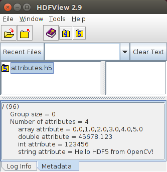 您可以从此处下载代码,或在 opencv_contrib 源代码库的 modules/hdf/samples/read_write_attributes.cpp 文件中找到它。