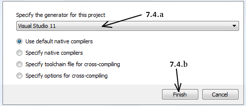 - 它将打开一个新窗口以选择编译器。选择适当的编译器(此处为 Visual Studio 11),然后单击 Finish。