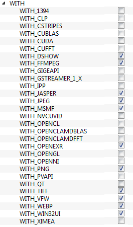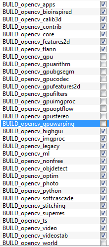 - 其余字段指定要构建的模块。由于 OpenCV-Python 尚不支持 GPU 模块,您可以完全避免它以节省时间(但是,如果您使用它们,请将其保留在那里)。参见下图: