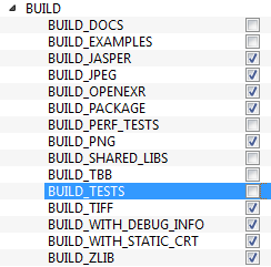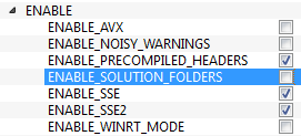 - 现在单击 ENABLE 字段以展开它。确保取消选中 ENABLE_SOLUTION_FOLDERS(Visual Studio Express 版本不支持解决方案文件夹)。参见下图: