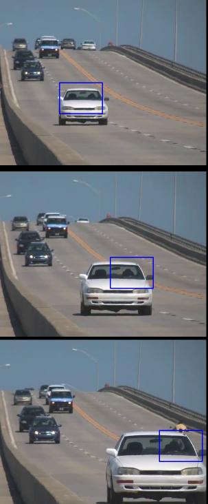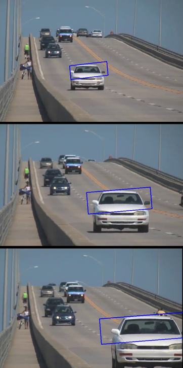 你仔细观察过上一个结果吗?存在一个问题。无论汽车离摄像头很远还是很近,我们的窗口总是保持相同的大小。这不好。我们需要根据目标的大小和旋转来调整窗口大小。解决方案再次来自“OpenCV实验室”,它被称为CAMshift(连续自适应均值漂移),由Gary Bradsky于1998年在其论文《用于感知用户界面的计算机视觉人脸跟踪》中发表 [40] 。