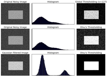 查看下面的示例。输入图像是一个嘈杂的图像。在第一种情况下,应用了值为 127 的全局阈值处理。在第二种情况下,直接应用了 Otsu 的阈值处理。在第三种情况下,首先用 5x5 高斯核过滤图像以去除噪声,然后应用 Otsu 阈值处理。看看噪声过滤如何改善结果。