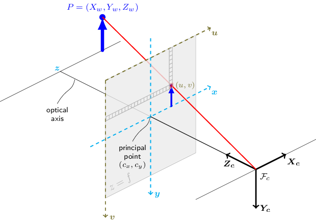 其中 \(x' = X_c / Z_c\) 和 \(y' = Y_c / Z_c\)。将内参和外参的方程放在一起,我们可以将 \(s \; p = A \begin{bmatrix} R|t \end{bmatrix} P_w\) 写成