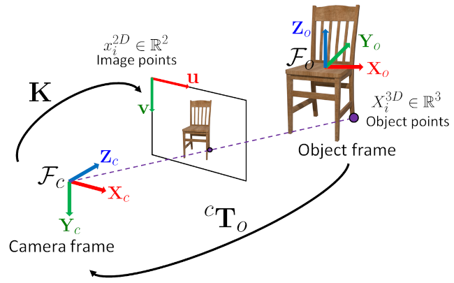 此图总结了整个过程。例如,由 solvePnP 函数或基准标记检测返回的物体姿态就是此 \( {}^{c}\mathbf{T}_o \) 变换。