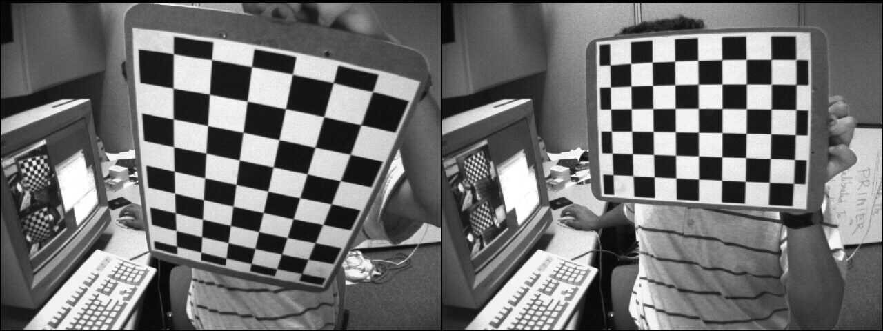 在此示例中,通过计算将源点映射到目标点的单应性,将源图像转换为所需的透视视图。下图显示了源图像(左)和我们想要转换为目标棋盘视图的棋盘视图(右)。