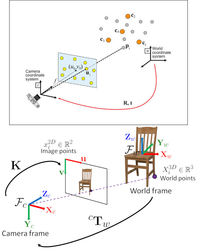 问题表述: 给定一组在世界参考系中表示的3D点 \(p_i\) 及其在图像上的2D投影 \(u_i\) 之间的对应关系,我们旨在检索相机相对于世界的姿态( \(R\) 和 \(t\))以及焦距 \(f\)。