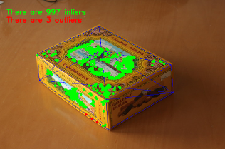 以下代码是主算法的第3步和第4步。第一步是调用上述函数,第二步是从RANSAC中获取输出的内点向量,以获得用于绘制的2D场景点。如代码所示,如果存在匹配项,我们必须确保应用RANSAC,否则,cv::solvePnPRansac函数可能会因为OpenCV的某个*bug*而崩溃。