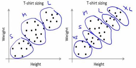 公司无法生产所有尺寸的 T 恤。相反,他们将人们划分为小号、中号和大号,并且只生产这 3 种型号,以适应所有人。这种将人们分成三组的做法可以通过 k-means 聚类来完成,该算法为我们提供了最佳的 3 个尺寸,这将满足所有人。如果它没有满足,公司可以将人们分成更多组,可能是五组,等等。查看下图