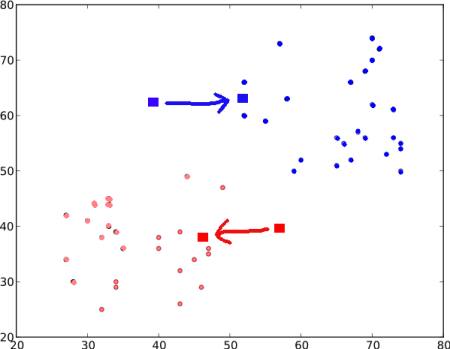 \[minimize \;\bigg[J = \sum_{All\: Red\_Points}distance(C1,Red\_Point) + \sum_{All\: Blue\_Points}distance(C2,Blue\_Point)\bigg]\]